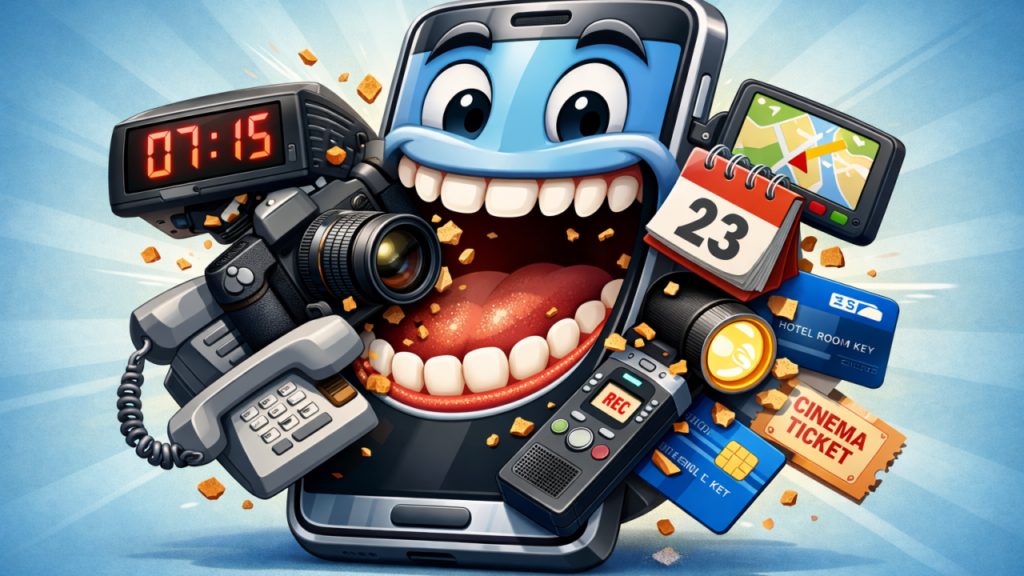Navigationsgeräte? Fast komplett ersetzt durch Smartphone-Navigation mit Echtzeitdaten. MP3-Player, Walkman, Discman? Streaming hat sie überholt. Radiowecker? Das Smartphone liegt sowieso neben dem Bett. Papierfahrkarten? Papierlos als QR-Code im Wallet. Festnetztelefon? In vielen Haushalten schlicht überflüssig geworden.