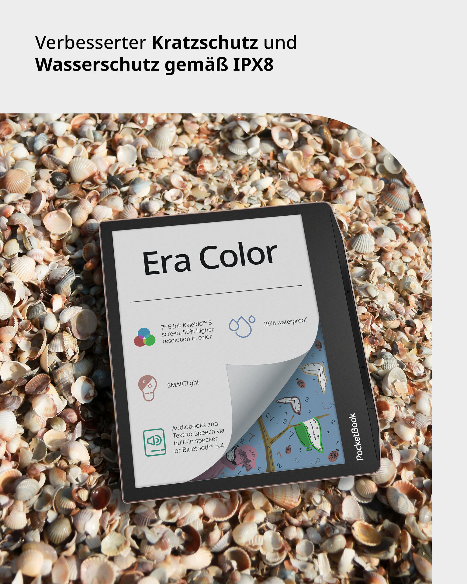Der PocketBook Era Color eröffnet mit seinem 17,78 cm (7 Zoll) E-Ink-Kaleido-3-Farbdisplay eine neue Dimension des digitalen Lesens: Comics, Mangas, Magazine und Sachbücher erwachen in brillanten Farben zum Leben – natürlich augenschonend und blendfrei. Die hohe Schwarz-Weiß-Auflösung sorgt für gestochen scharfe Texte und höchsten Lesekomfort.