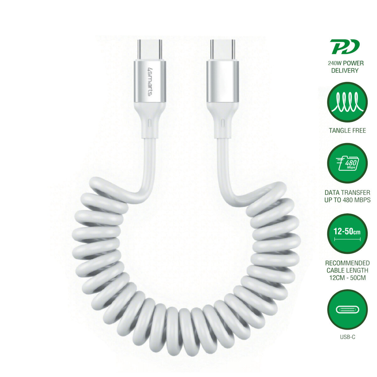 Mit nur 12 cm im Ruhezustand ist das Kabel deutlich kürzer als herkömmliche Spiralkabel – ideal für minimalistische Setups. Es dehnt sich bei Bedarf elegant auf bis zu empfohlene 50 cm und zieht sich danach blitzschnell zurück – praktisch, sauber, immer perfekt angepasst. Zieh das Kabel nicht öfter und viel länger als 50 cm, damit es flexibel und formstabil bleibt.