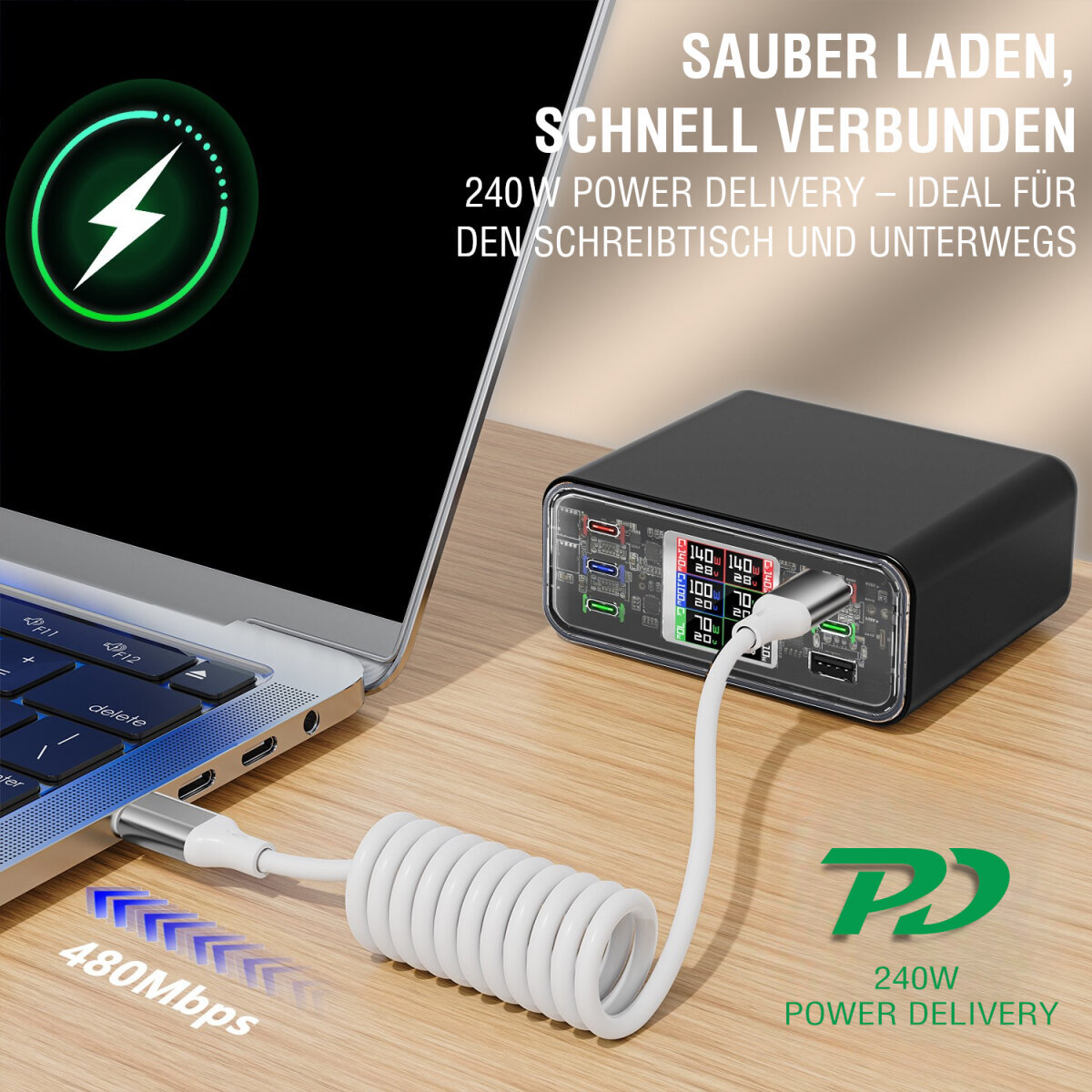 Mit vollen 240 W Power Delivery und 480 Mbit/s Datenrate übertrifft dein Kabel günstige 60 W-Alternativen und bietet echte High Speed Performance. So kannst du Handy, Tablet oder Laptop unterwegs blitzschnell laden und Daten zuverlässig übertragen – alles in einem.