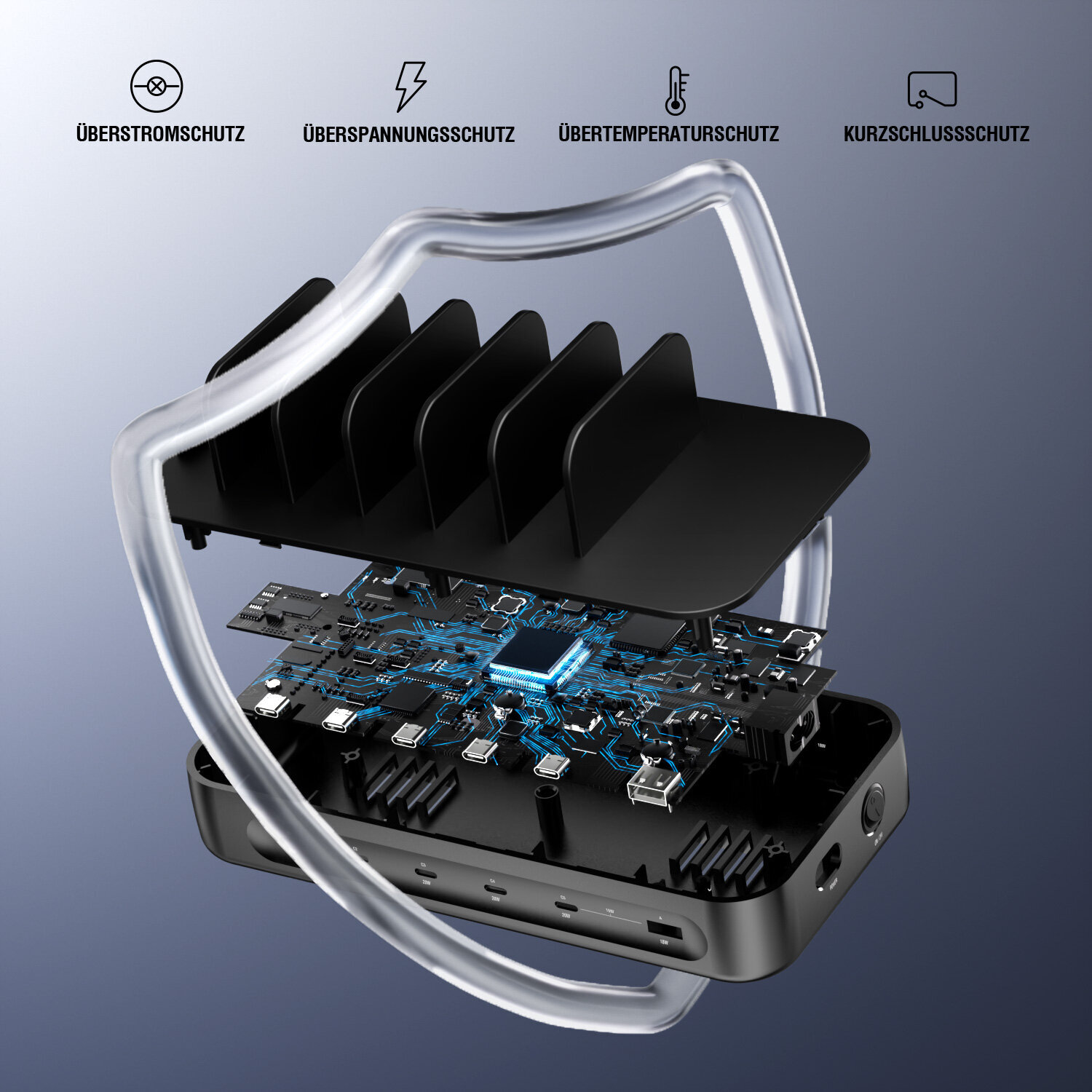 Damit deine Geräte optimal geschützt sind, ist die 4smarts Ladestation mit modernsten Sicherheitsmechanismen ausgestattet: Überstromschutz, Überspannungsschutz, Übertemperaturschutz und Kurzschlussschutz. Mit dem praktischen Power-Knopf kannst du alle angeschlossenen Geräte mit nur einem Klick sicher vom Strom trennen. Diese USB-C-Ladestation für mehrere Geräte ist nicht nur effizient, sondern auch sicher – für dein Zuhause, Büro oder Vereinsleben.
