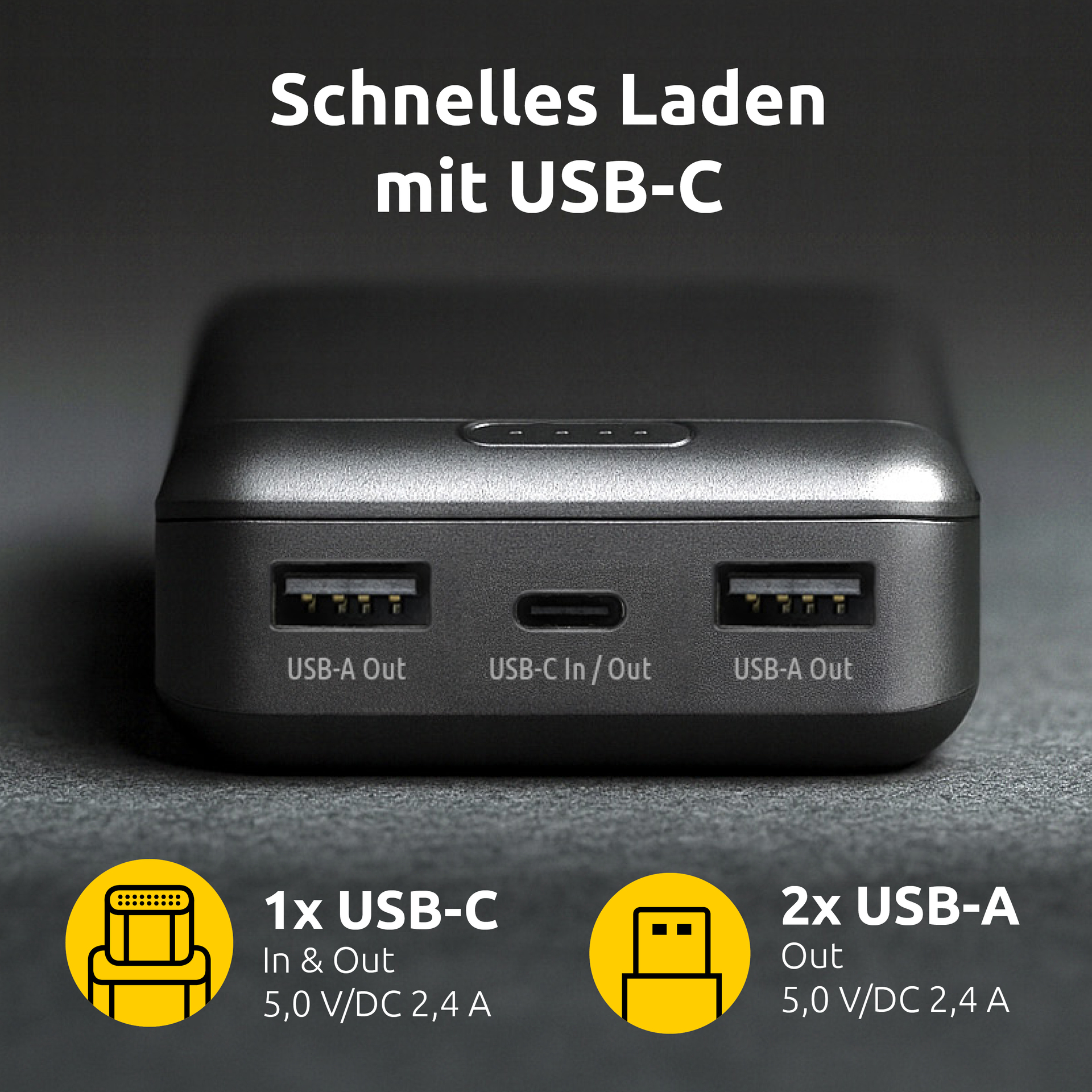 - 1 USB-C-Ein- und Ausgang sowie 2 USB-A-Ausgänge