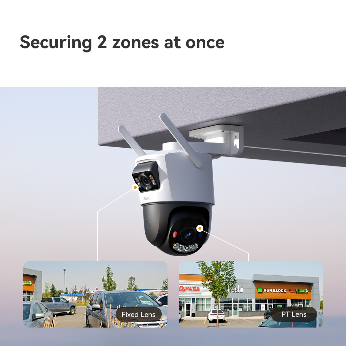 - Zwei Objektive mit einer Gesamtauflösung von 8 MP - 4 MP Festobjektiv + 4 MP Schwenk-Neige-Objektiv
