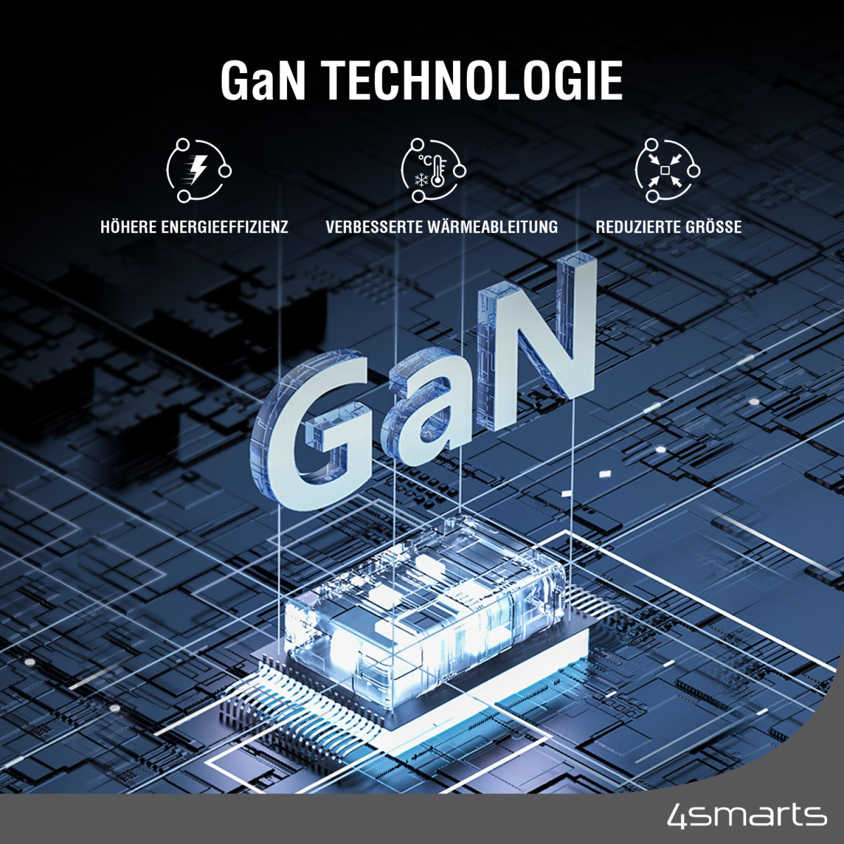 Die Verwendung von Galliumnitrid (GaN) ermöglicht eine bessere Ladeperformance bei weniger Wärmeentwicklung. Die einzelnen Komponenten können so auf engerem Raum platziert werden. Das Resultat - hohe Effizienz in einem viel kleineren Ladegerät.