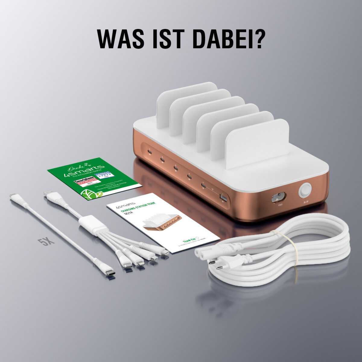 Die 4smarts Ladestation Team ist die ideale Lösung für alle, die viele Geräte gleichzeitig und organisiert laden möchten – ob zu Hause, im Büro, im Vereinsheim oder unterwegs. Mit insgesamt sechs Anschlüssen (5x USB-C, 1x USB-A) und dem innovativen 4-in-1-Multiladekabel können bis zu neun Geräte gleichzeitig geladen werden. Dank der Unterstützung für USB-C, Lightning und Micro-USB ist sie kompatibel mit einer Vielzahl an Smartphones, Tablets und weiteren Geräten vom VR-Headset bis hin zu E-Zigaretten wie z.B. der IQOS – von aktuellen Modellen bis hin zu älteren Ausführungen. Eine praktische USB-Ladestation für mehrere Geräte, die für alle Einsatzzwecke geeignet ist.