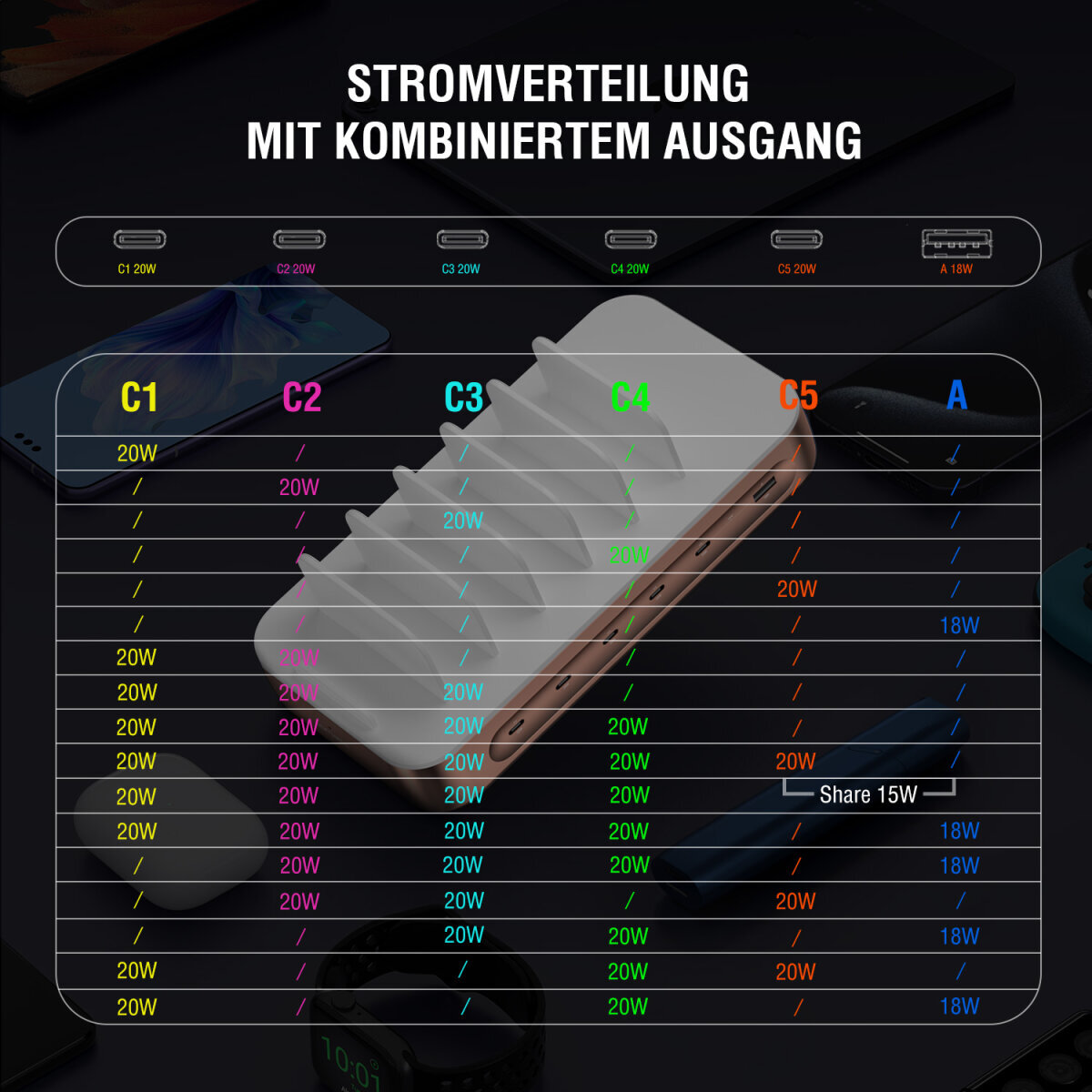- Schnelle Stelle: Bis zu 5 Geräte parallel mit 20 Watt aufladen