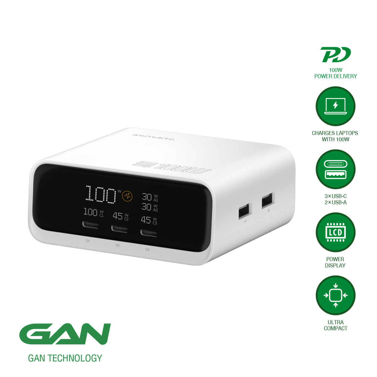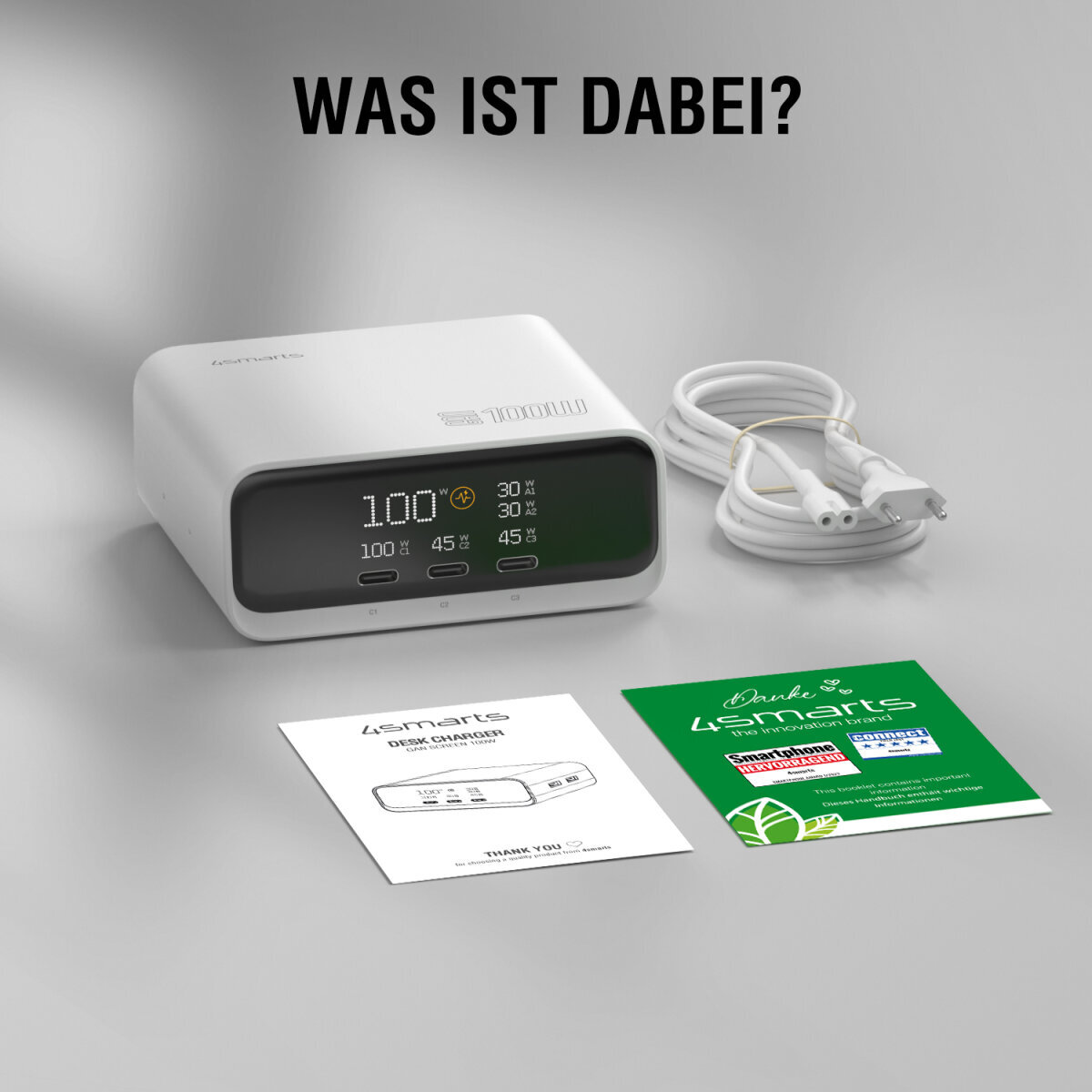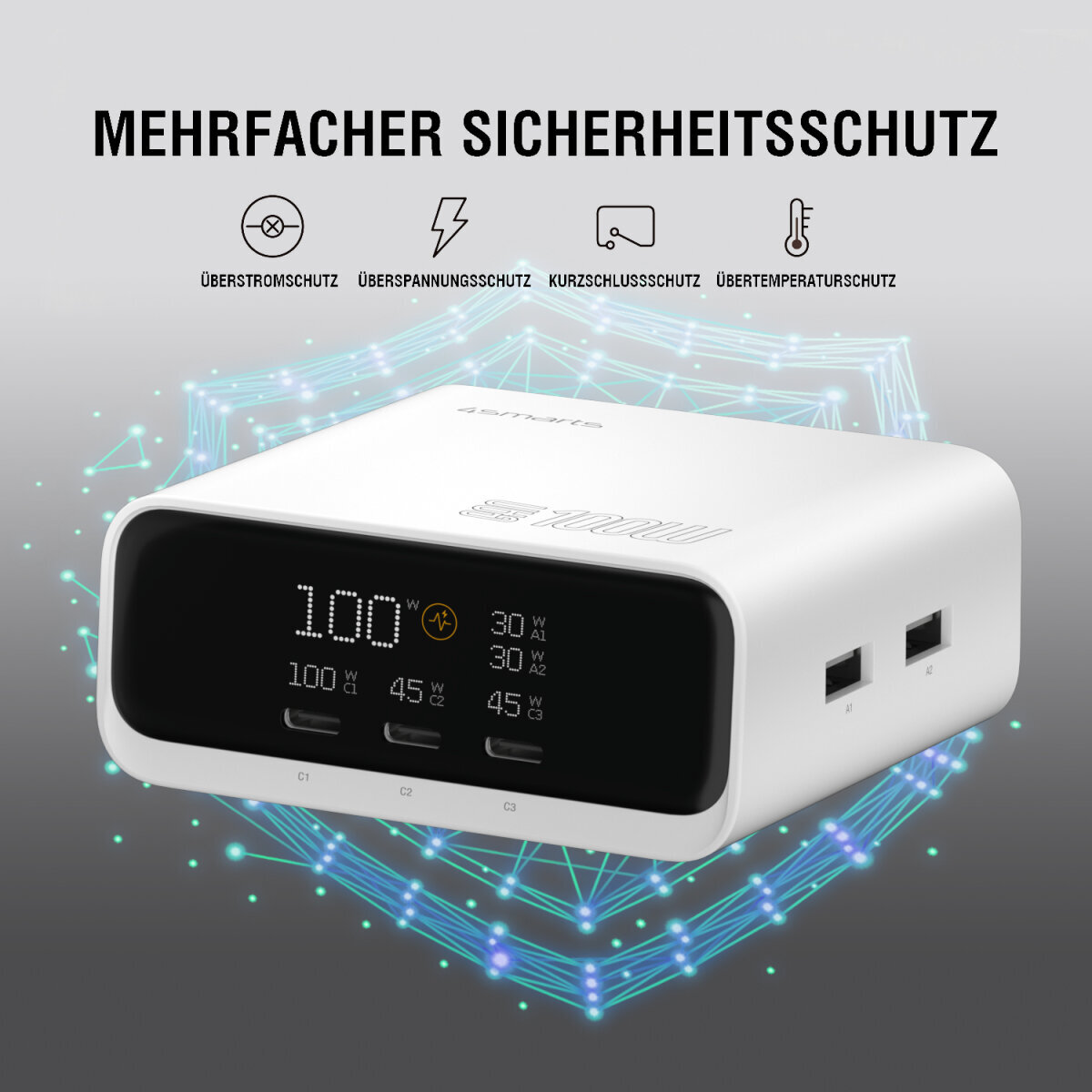 - 4smarts Desk Charger GaN Screen 100 W 3 USB-C+2 A