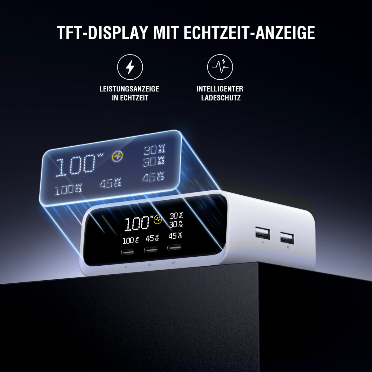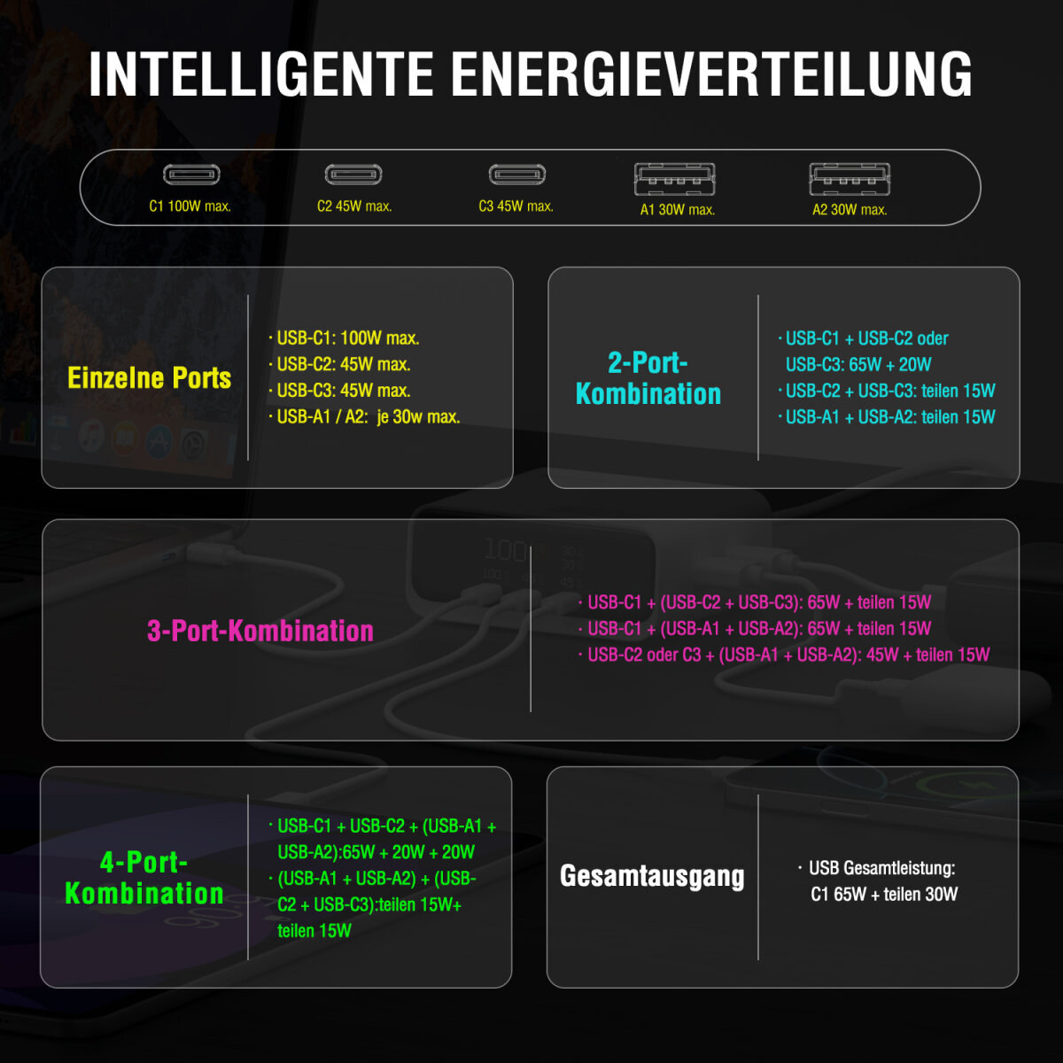- 100 W Schnellladen: Ein USB-C Port liefert volle 100 W für Laptops, bei mehreren Geräten wird die Leistung intelligent verteilt