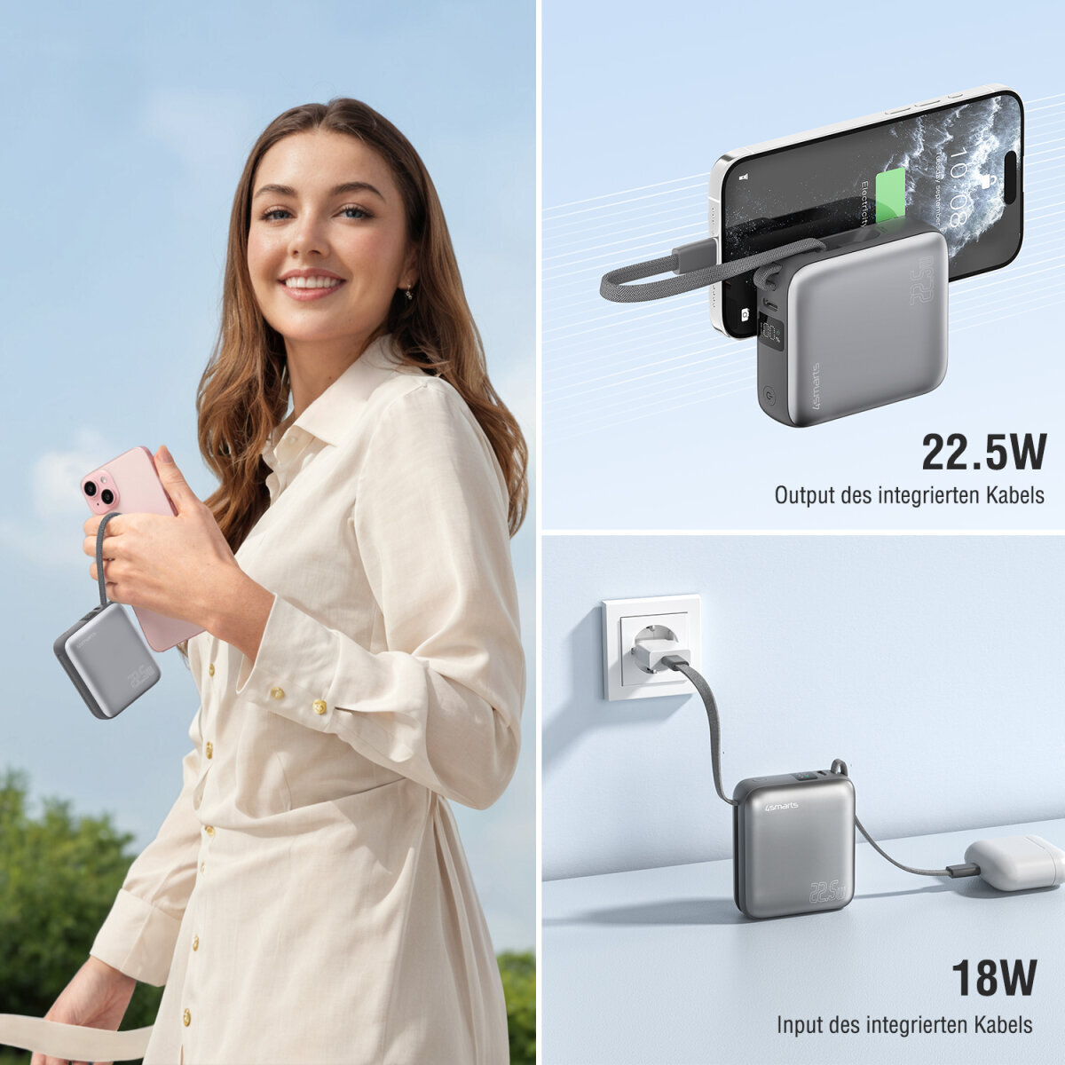 Die Powerbank bringt zwei fest verbaute USB-C Kabel und einen zusätzlichen Port mit. Das primäre Kabel mit bis zu 22,5 W eignet sich perfekt zum Schnellladen deines Smartphones und kann bei Bedarf sogar die Powerbank selbst aufladen. Das zweite Kabel ist ideal, um kleinere Geräte wie TWS-Kopfhörer oder deine Smartwatch zuverlässig mit Strom zu versorgen. Über den zusätzlichen USB-C Port lädst du parallel ein Tablet oder ein zweites Smartphone. So hast du immer die passende Lösung zur Hand – ohne zusätzliches Kabel-Chaos.