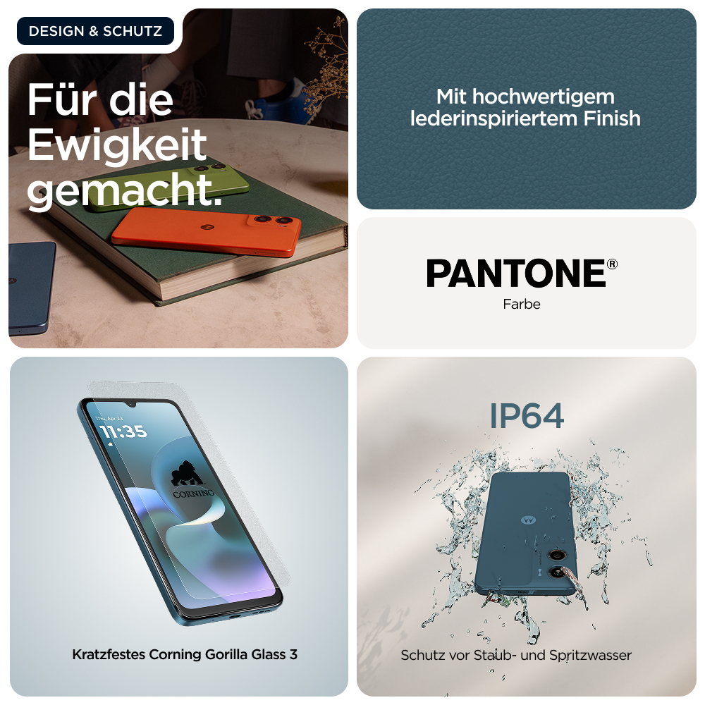 Motorola präsentiert das moto g06 – ein Smartphone, das deine Erwartungen weit übertreffen wird. Erwecke deine Lieblingssendungen und -filme zum Leben auf einem riesigen, hellen 17,48 cm (6,88 Zoll) Display, Motorolas bisher größtem auf dem moto g, mit Stereo-Lautsprechern und Dolby Atmos-Sound. Mit dem KI-basierten 50-MP Kamerasystem machst du atemberaubende Fotos bei jedem Licht. Supereffizientes Multitasking mit bis zu 12 GB RAM mit RAM-Boost. Alles ganz entspannt dank erweiterter Funktionen für eine längere Lebensdauer und Premiumdesign, darunter IP64-Wasserschutz, Corning Gorilla Glass 3 und lederinspiriertem Finish. Mit einmal Laden bist du 2 Tage dabei. Und exklusive Moto-Funktionen machen dein Smartphone sicherer, individueller und unterhaltsamer. Mit Circle-to-Search kannst du sofort alles auf deinem Smartphone suchen. Hol dir mehr mit dem moto g06.