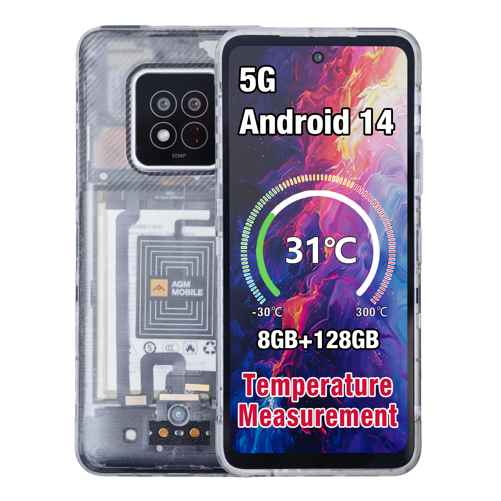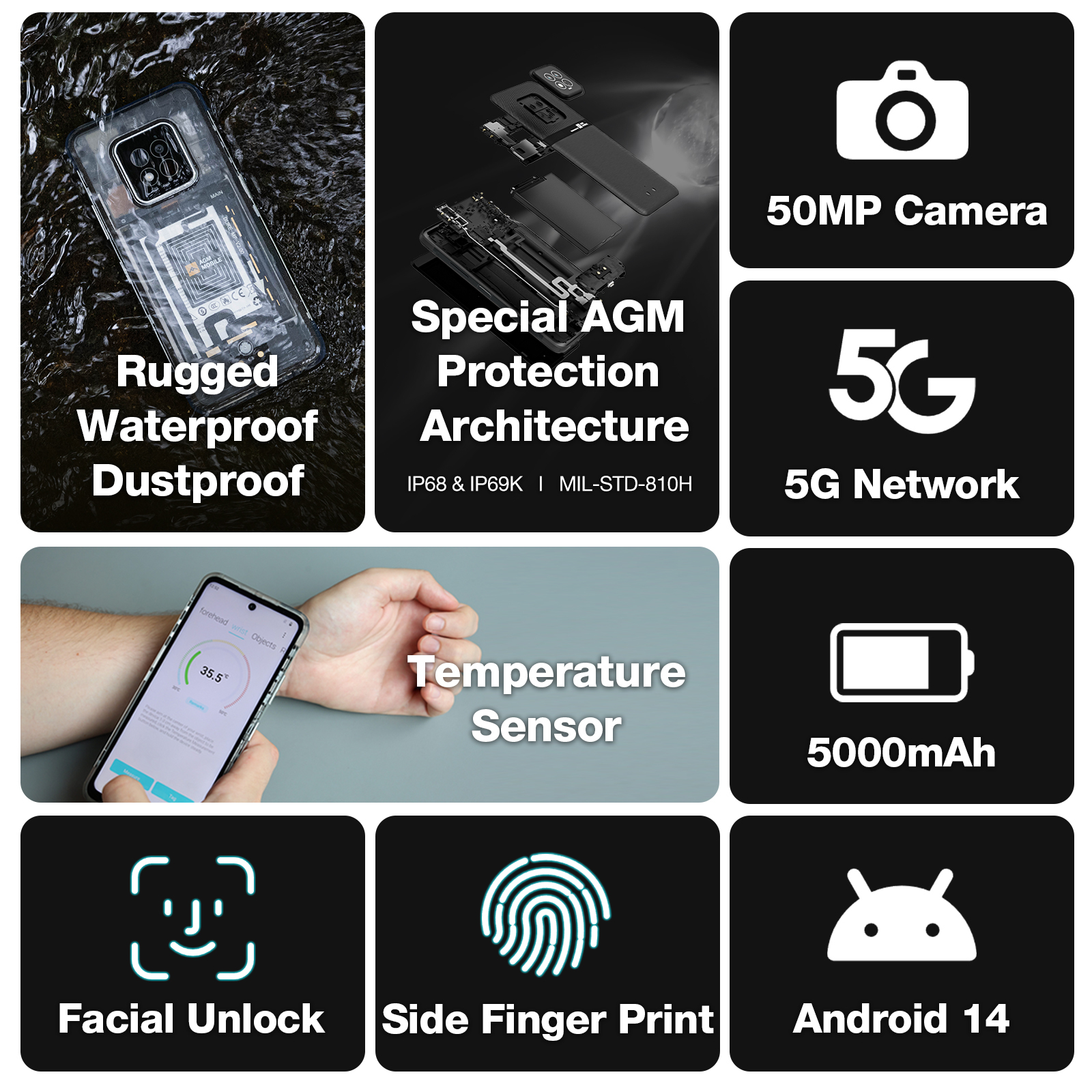 Das neue 5G Smartphone überzeugt durch sein robustes Design und ist nach IP68/IP69K und MIL-STD-810H zertifiziert, was es extrem widerstandsfähig macht. Mit 8 GB RAM (4+4) und 128 GB ROM bietet es ausreichend Speicherplatz und Leistung, unterstützt durch den T750 Octa-Core 2.0 GHz Prozessor. Die 5.000 mAh Batterie sorgt für eine lange Akkulaufzeit, während die 50 Megapixel Hauptkamera und die 16 Megapixel Frontkamera beeindruckende Fotos und Selfies ermöglichen. Das 17,22 cm (6,78 Zoll) FHD Incell Display mit 60 Hz bietet eine klare und flüssige Darstellung. Ausgestattet mit Android 14, Dual SIM, Temperaturmessung, NFC und Fingerprint ist dieses Smartphone ein echter Alleskönner für den anspruchsvollen Nutzer.