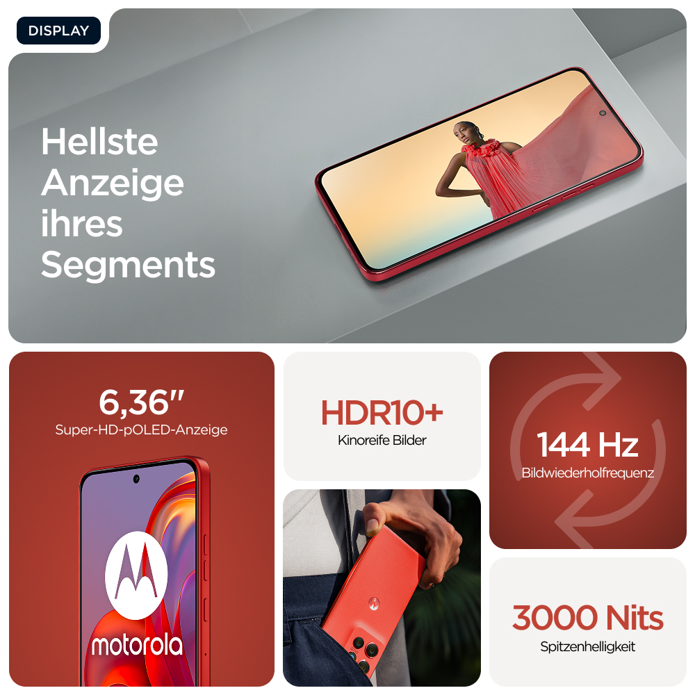 Das motorola edge 60 neo kombiniert elegantes Design mit robuster Technik und leistungsstarker Ausstattung. Mit seinem 16,15 cm (6,36 Zoll) pOLED-Display, dem MediaTek Dimensity 7400 Prozessor und 12 GB RAM bietet es ein flüssiges Nutzererlebnis – ideal für Multitasking, Gaming und Streaming. Die 50-MP-Hauptkamera mit optischer Bildstabilisierung sorgt für gestochen scharfe Aufnahmen, während der 5000-mAh-Akku mit 68W-TurboPower-Laden für langanhaltende Nutzung sorgt. Dank IP68/IP69-Zertifizierung und MIL-STD 810H erfüllt das Gerät höchste Ansprüche an Widerstandsfähigkeit – perfekt für den Alltag und darüber hinaus.