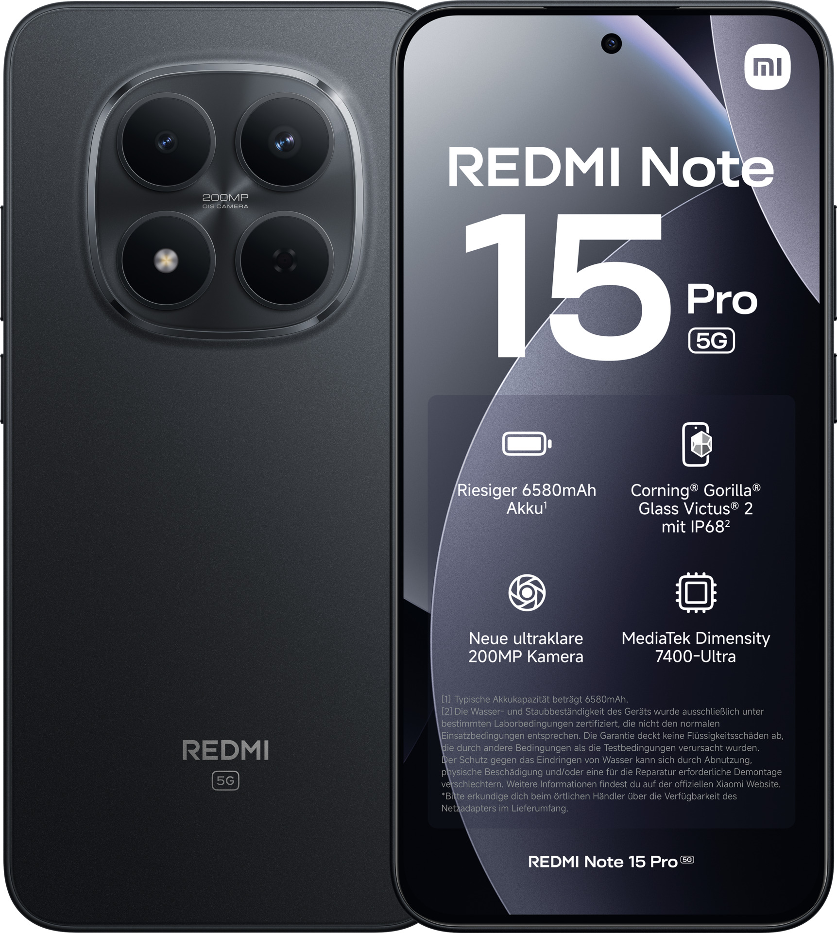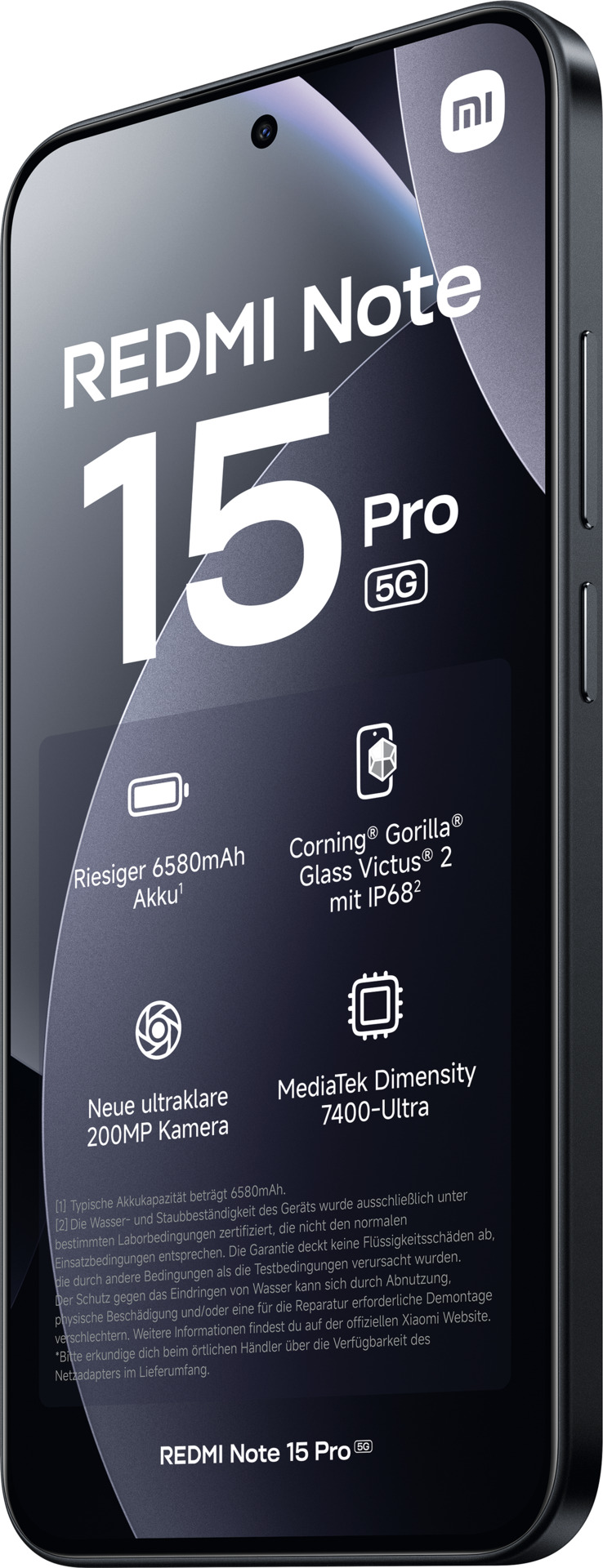Das Redmi Note 15 Pro 5G überzeugt mit einem kräftigen 6.580 mAh Akku für optimale Balance zwischen Ladegeschwindigkeit und Langlebigkeit. Das Gerät bleibt dank Gorilla Glass Victus 2 und IP68-Zertifizierung zuverlässig robust – für deine Abenteuer des Alltags. Die neue 200 Megapixel HPE-Kamera mit fünf Brennweiten und KI-Kreativassistenten ermöglicht scharfe Aufnahmen und kreative Bildgestaltung in jeder Situation. Angetrieben vom MediaTek Dimensity 7400-Ultra liefert das Smartphone effiziente Performance für Gaming, Multitasking und lange Nutzung ohne Überhitzung. Mit dem brillanten 17,35 cm (6,83 Zoll) 1,5K Display, Dolby Atmos Stereo-Sound und stylischem vulkanförmigen Kameradesign verbindet es Ergonomie mit elegantem Look.