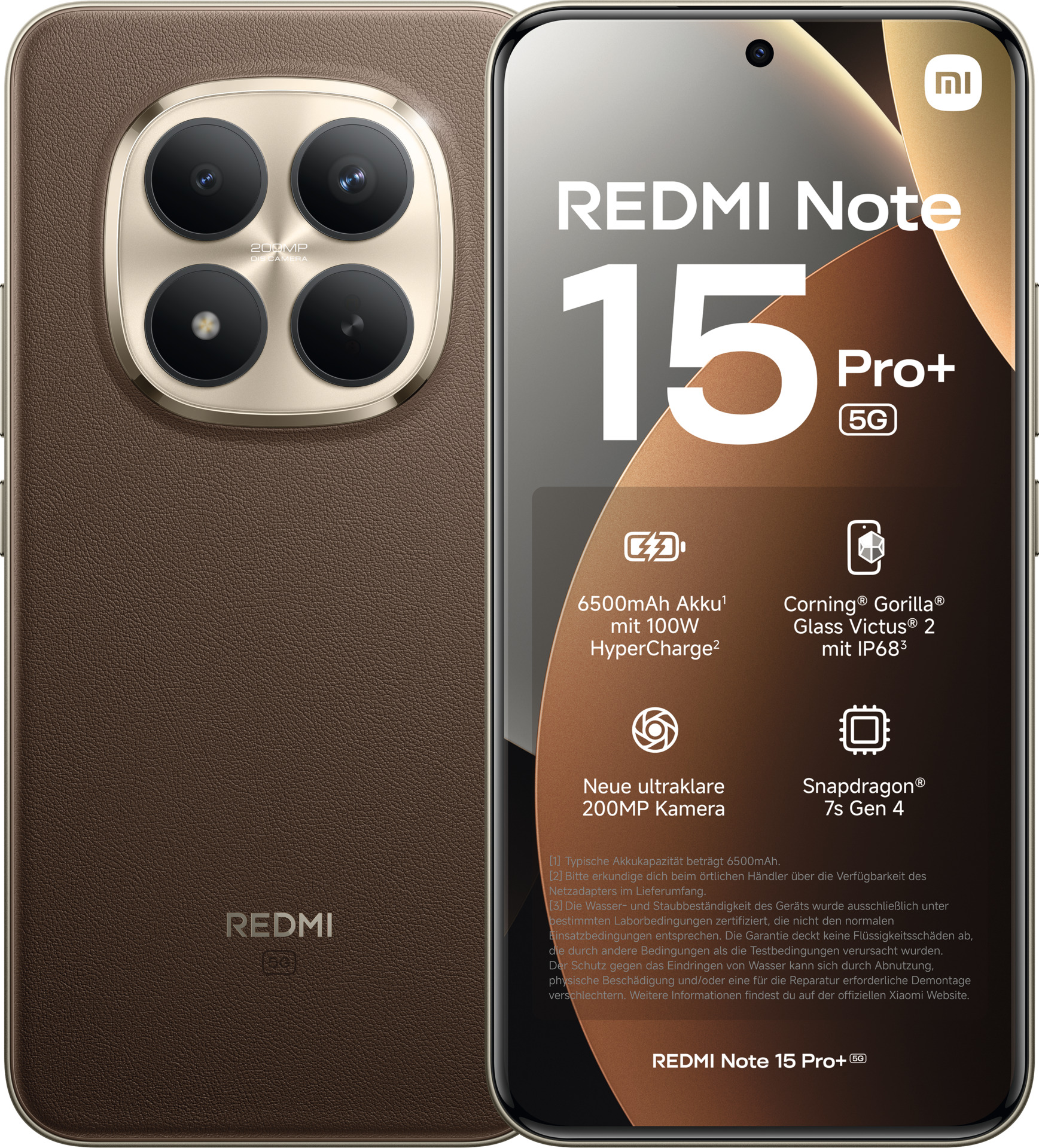 Das Redmi Note 15 Pro+ 5G bietet mit seinem 6.500 mAh Silizium-Kohlenstoff-Akku beeindruckende Ausdauer. Die robuste Struktur, Corning Gorilla Glass Victus 2 und IP68 schützen zuverlässig vor Stürzen, Staub und Wasser im Alltag. Die neue 200 Megapixel HPE-Kamera liefert außergewöhnliche Klarheit, unterstützt von KI-Tools für kreative Freiheit. Das brillante 17,35 cm (6,83 Zoll) 1,5K Display sorgt mit bis zu 3.200 Nits für perfekte Sicht, während der Snapdragon 7s Gen 4 starke Performance im Alltag und beim Gaming liefert. Elegantes Design, Dolby-Atmos-Sound und Offline-Kommunikation runden das Erlebnis eindrucksvoll ab.