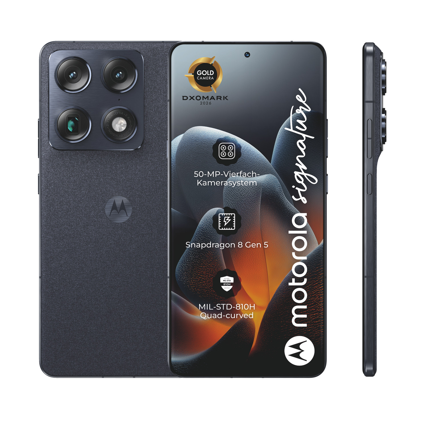 Motorola präsentiert die brandneue motorola signature-Serie – eine sinnvolle Kombination aus Technologie und Design, die die Motorola-DNA widerspiegelt. Angefangen bei den konturierten Kanten und einem ultraflachen Profil, das so gestaltet ist, dass es die raffinierteste Silhouette bildet, bis hin zum Aluminium im gesamten Rahmen, das für mehr Eleganz und Widerstandsfähigkeit verwendet wird. In Kombination mit einzigartigen Oberflächen und Materialien ergibt sich ein sensorisches Erlebnis, das unvergleichlich ist. Im Inneren bieten motorola signature-Geräte ultimative Leistung, die mit dem DXOMARK Gold Label für höchste Standards in Sachen Bildqualität ausgezeichnet wurde. Mit Sony LYTIA-Sensoren, Dolby Vision-Aufnahme und dem Snapdragon 8 Gen 5 Prozessor der nächsten Generation hast du die nötige Leistung, um Momente wie nie zuvor einzufangen. Mit exklusiven, maßgeschneiderten Services und bis zu sieben Jahren Betriebssystem- und Sicherheitsupdates wird dein Gesamterlebnis aufgewertet. Erwarte das Beste von motorola signature.