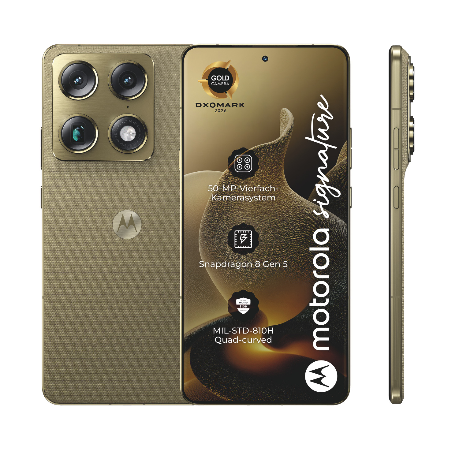 Motorola präsentiert die brandneue motorola signature-Serie – eine sinnvolle Kombination aus Technologie und Design, die die Motorola-DNA widerspiegelt. Angefangen bei den konturierten Kanten und einem ultraflachen Profil, das so gestaltet ist, dass es die raffinierteste Silhouette bildet, bis hin zum Aluminium im gesamten Rahmen, das für mehr Eleganz und Widerstandsfähigkeit verwendet wird. In Kombination mit einzigartigen Oberflächen und Materialien ergibt sich ein sensorisches Erlebnis, das unvergleichlich ist. Im Inneren bieten motorola signature-Geräte ultimative Leistung, die mit dem DXOMARK Gold Label für höchste Standards in Sachen Bildqualität ausgezeichnet wurde. Mit Sony LYTIA-Sensoren, Dolby Vision-Aufnahme und dem Snapdragon 8 Gen 5 Prozessor der nächsten Generation hast du die nötige Leistung, um Momente wie nie zuvor einzufangen. Mit exklusiven, maßgeschneiderten Services und bis zu sieben Jahren Betriebssystem- und Sicherheitsupdates wird dein Gesamterlebnis aufgewertet. Erwarte das Beste von motorola signature.