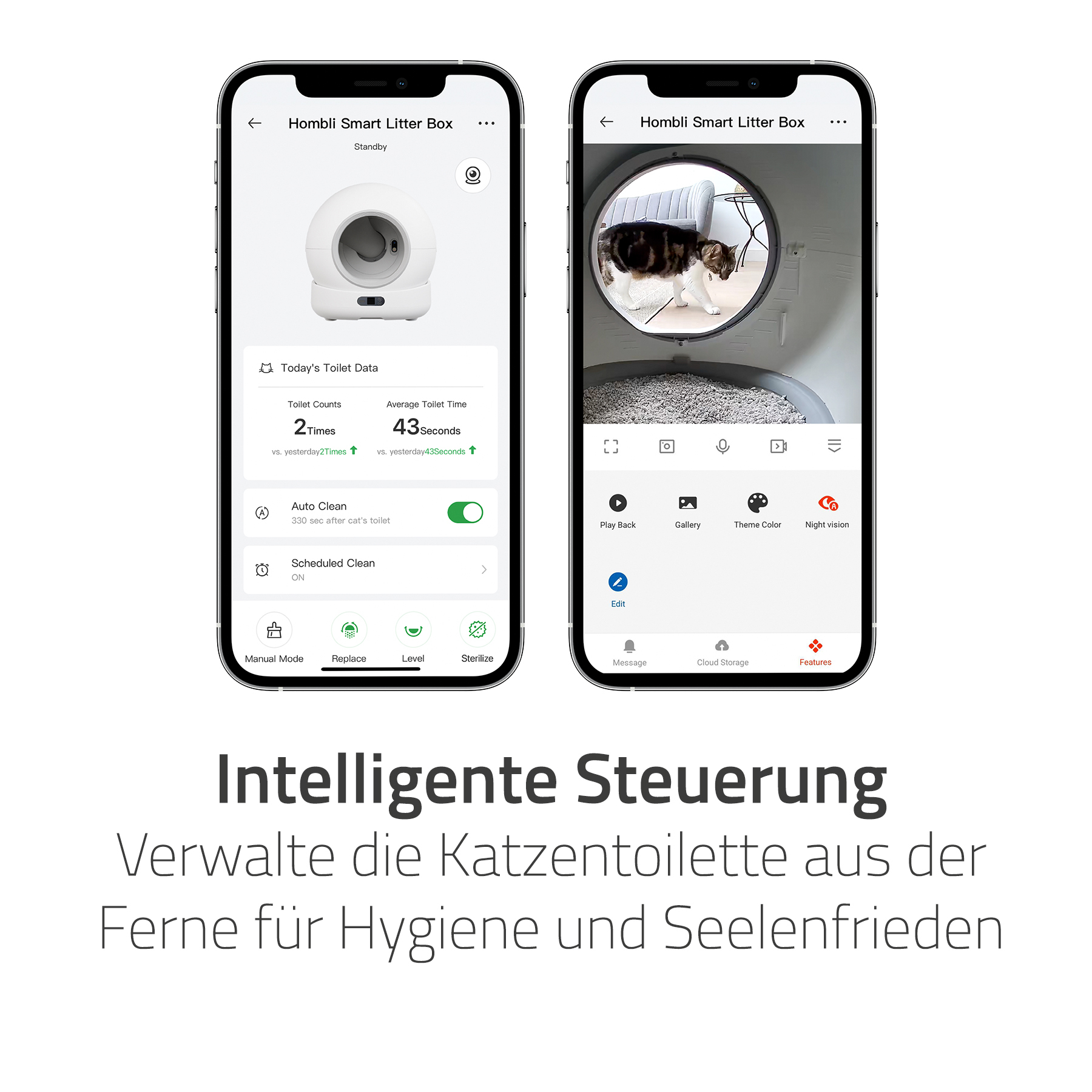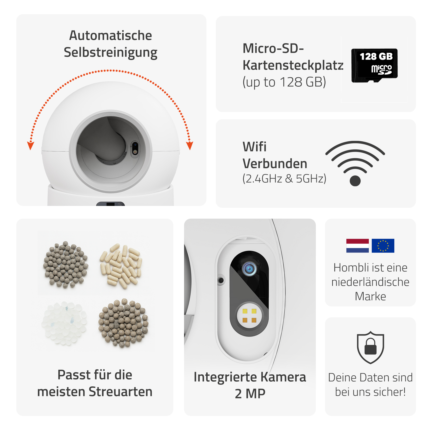 - Kompatibel mit Amazon Alexa und Google Home, integriert sich die Hombli Smart Cat Litter Box nahtlos in andere Smart Home Systeme