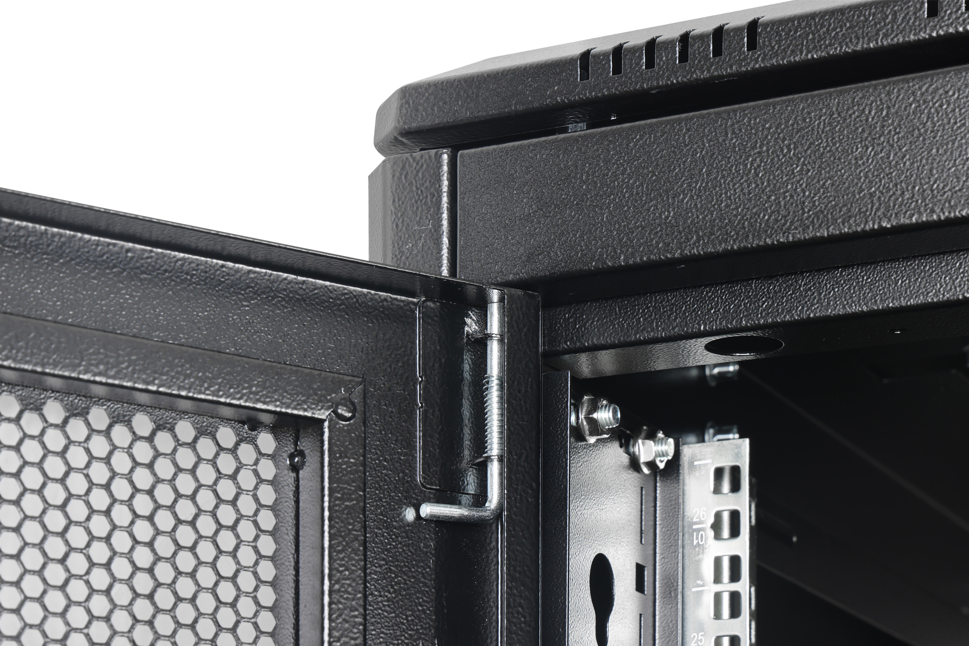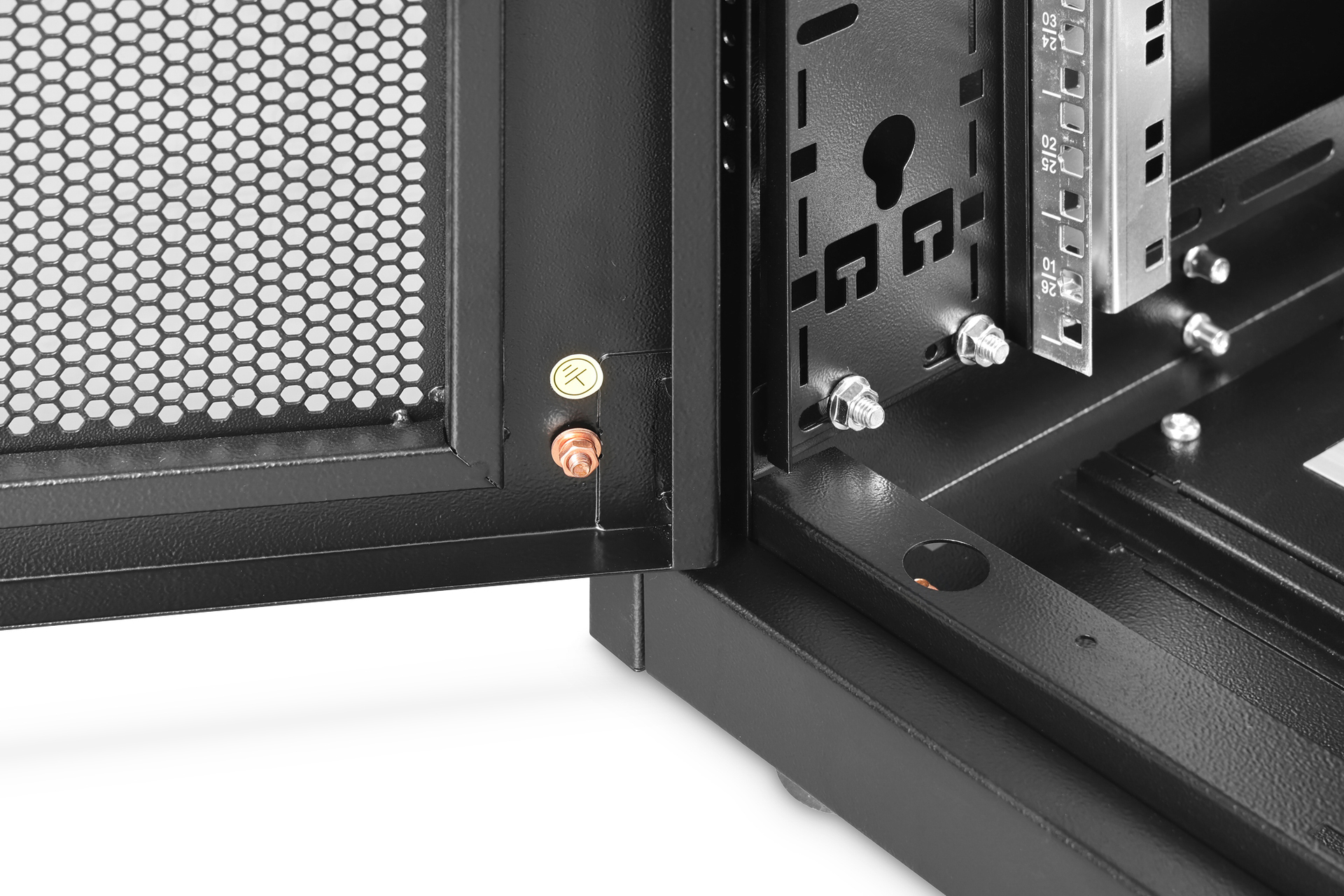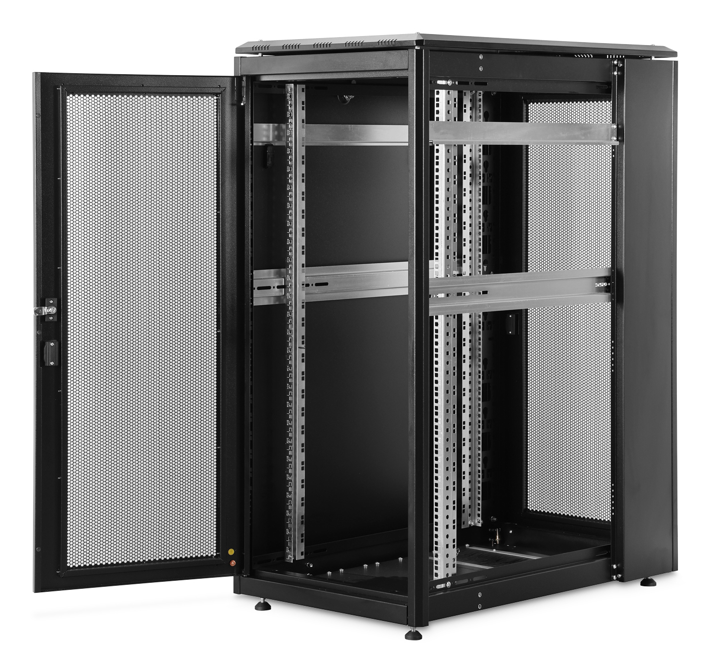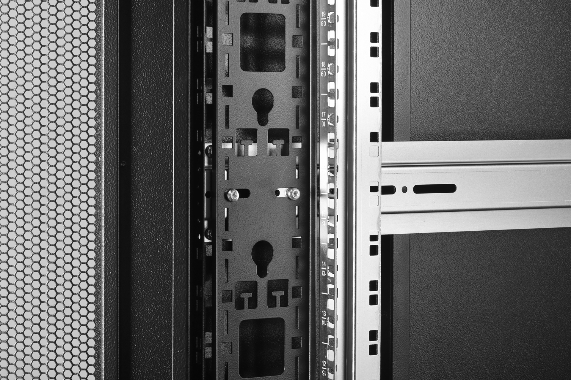 - Integrierte PDU-Halterungen im hinteren Schrankbereich links und rechts